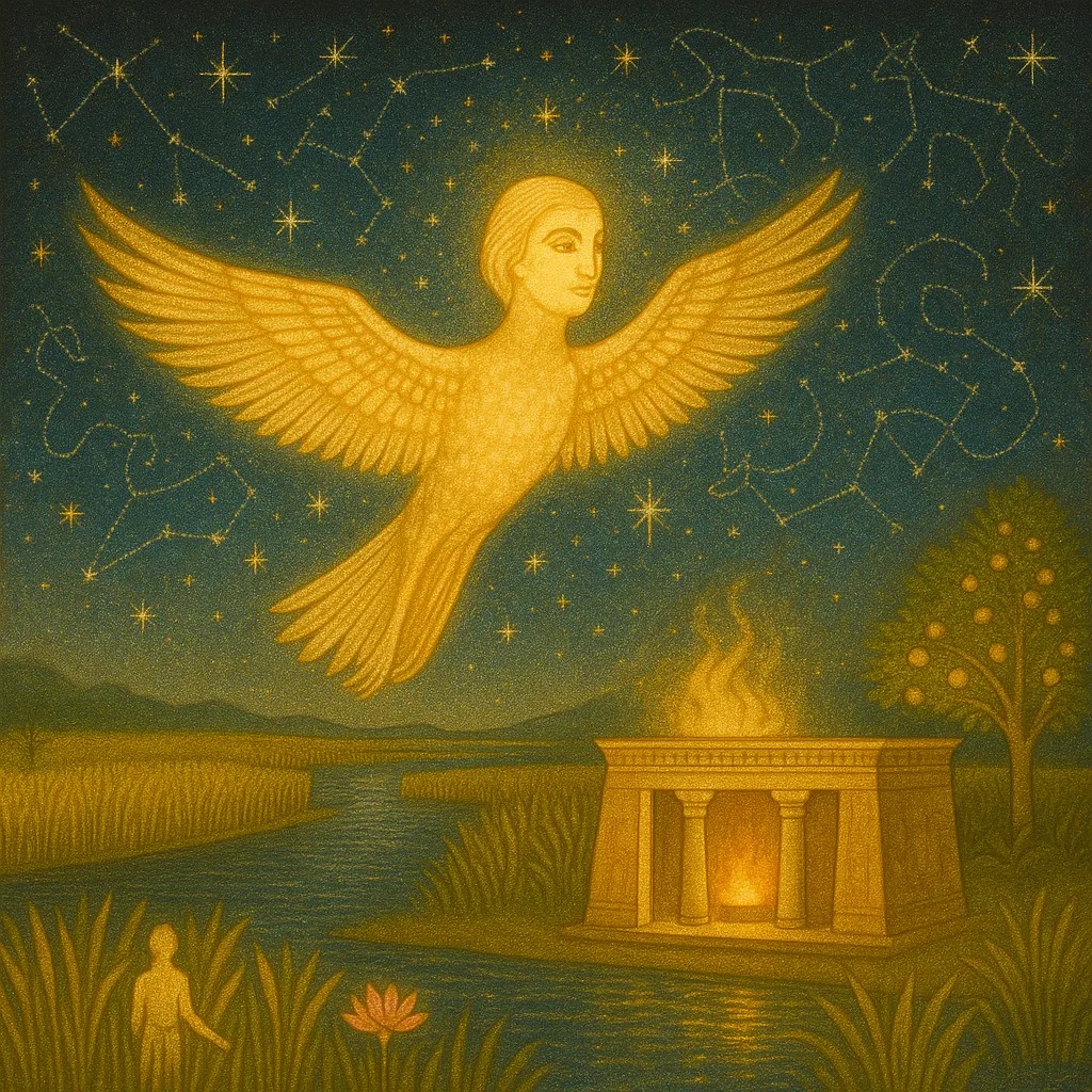 It was often depicted as a luminous bird, sometimes a crested ibis or glowing heron, flying freely above the land. A being of awareness, will, and eternal presence.