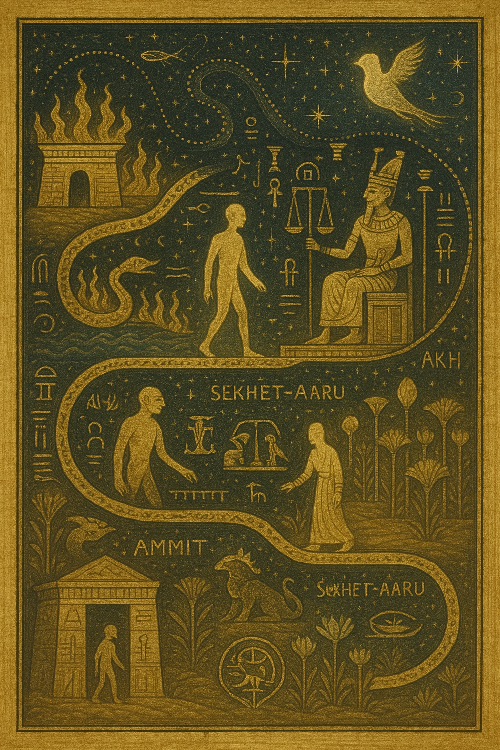 - The Egyptian underworld, a mysterious realm of trials, serpents, and gates through which the soul journeys after death.
